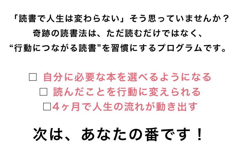 奇跡の読書法では流行に左右されず、あなた自身のために必要な本を選ぶ力を作っていきましょう。